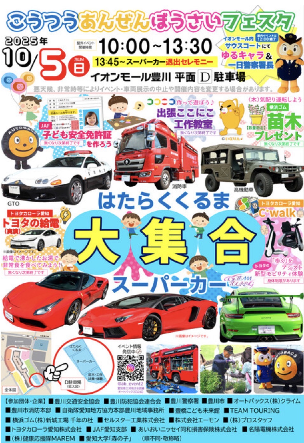 当日は、「はたらくくるま」&「スーパーカー」の大集合し、豊川警察署のパトカー、消防本部の消防車、自衛隊の高機動車などの働くクルマを間近で見学できます。