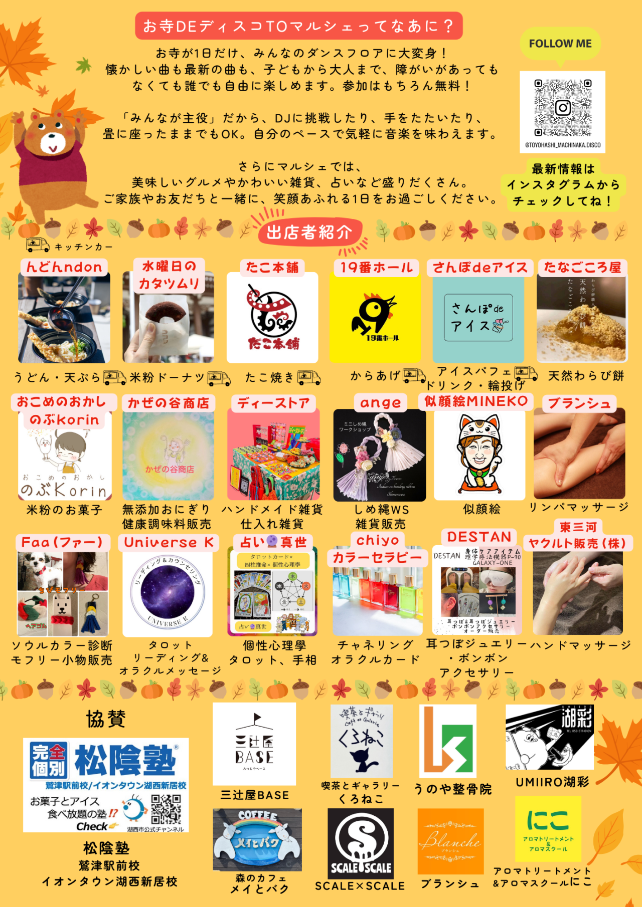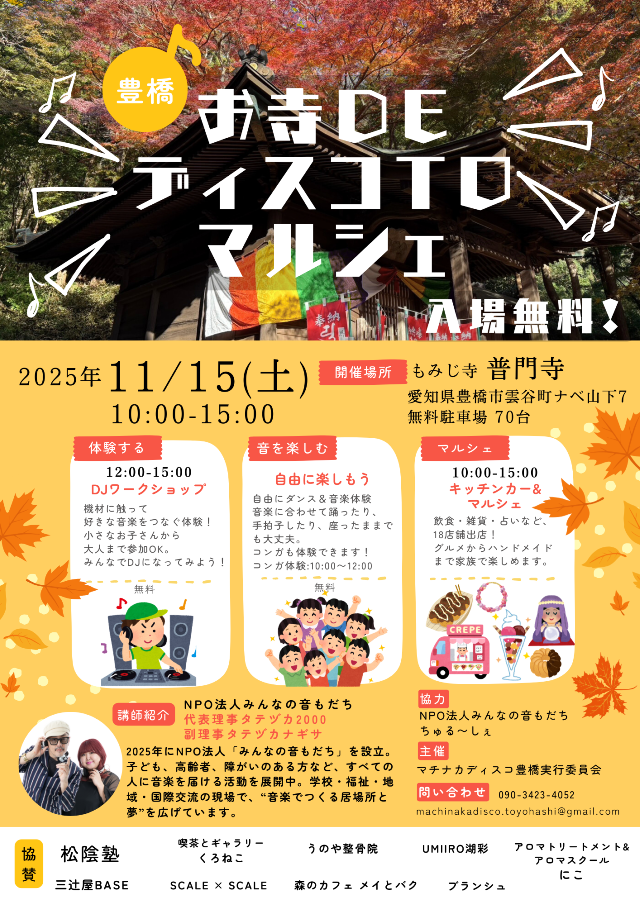 2025年11月15日(土)、豊橋市にある普門寺(ふもんじ)が、「お寺DEディスコTOマルシェ」として一日限定で世代を超えて楽しめる最高の遊び場に変身します!