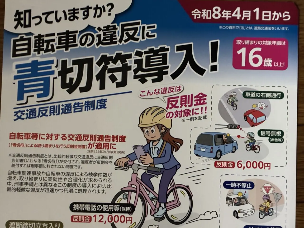 これまで悪質な交通違反に限り「赤切符」(刑事罰の対象)が交付されていた自転車の運転について、2026年4月1日(水)より、比較的軽い違反に対しても「青切符(交通反則通告制度)」が適用されることが決定しました。