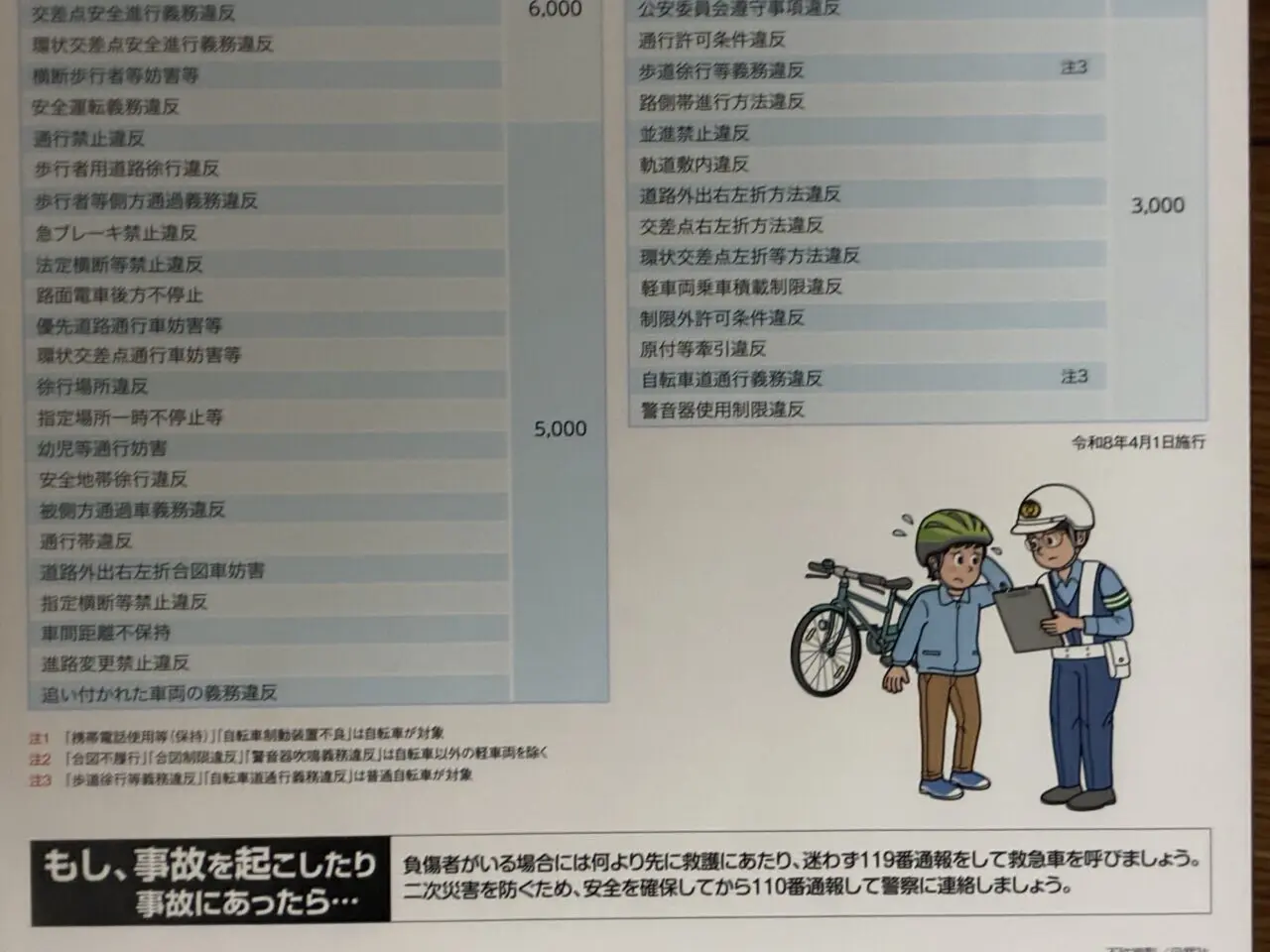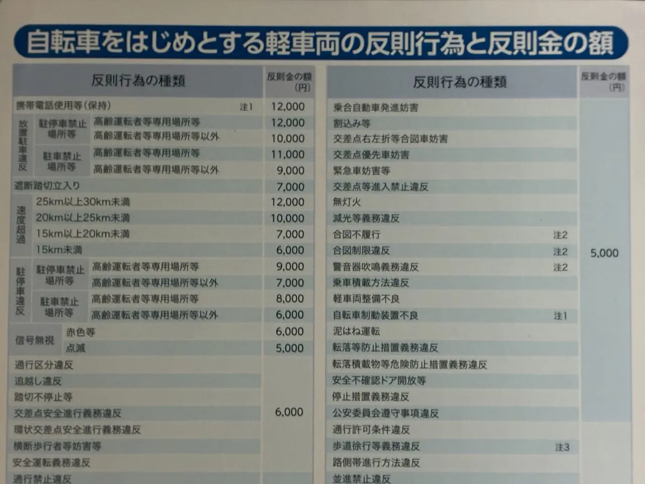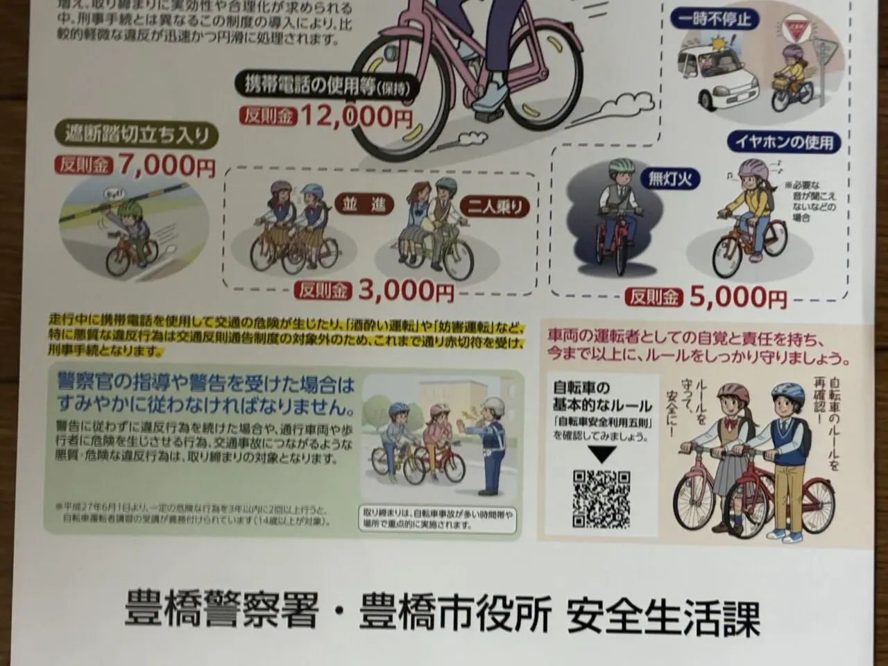 携帯電話の使用等(保持)については反則金12,000円、無灯火やイヤホンの使用には反則金5,000円、自転車並進や二人乗りについては反則金3,000円が課せられます。