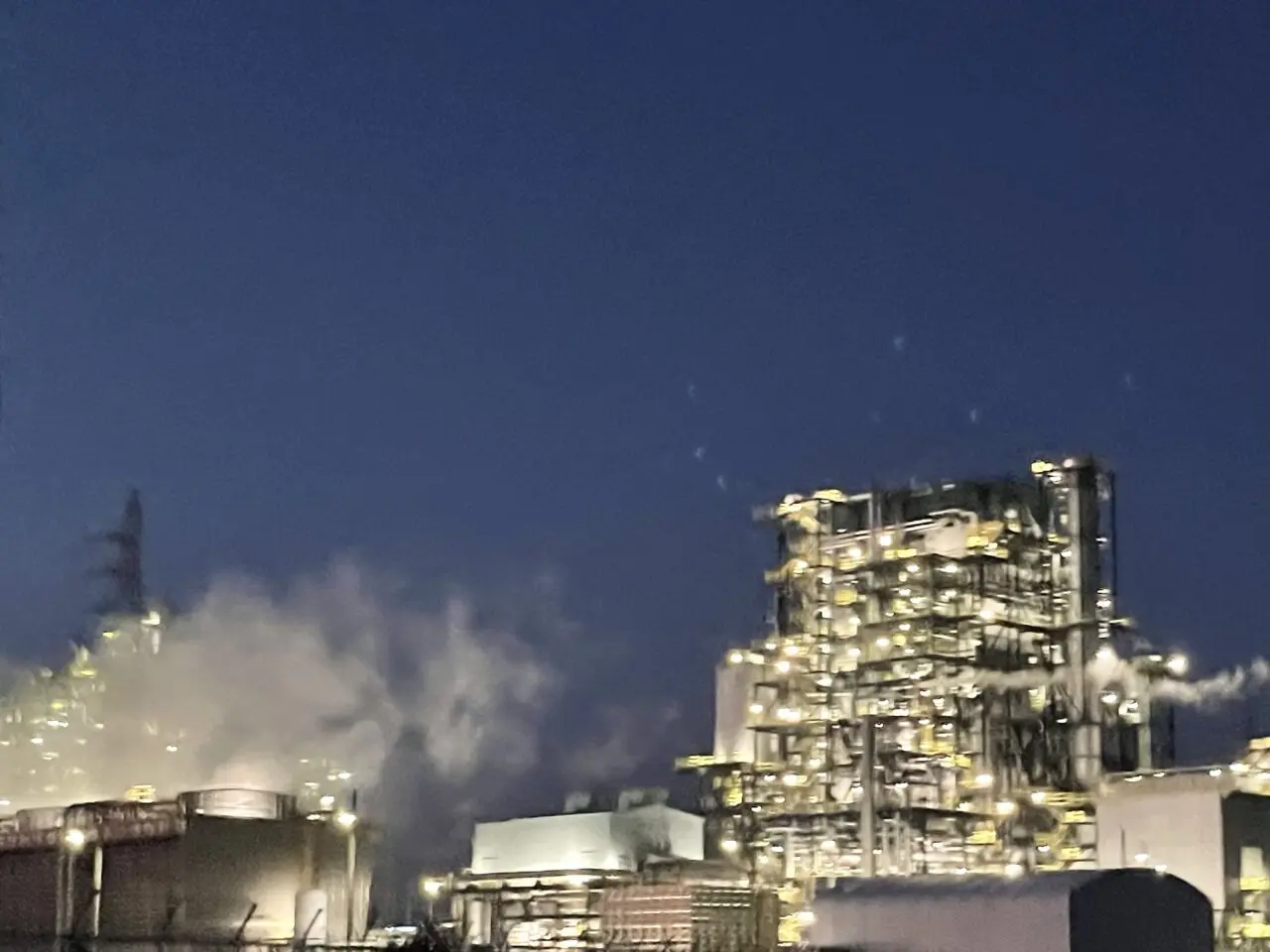 施設全体を覆うパイプやタンクが、蒸気と共にオレンジ色のナトリウムランプや暖色系の照明に照らされ、漆黒の闇に浮かび上がります。