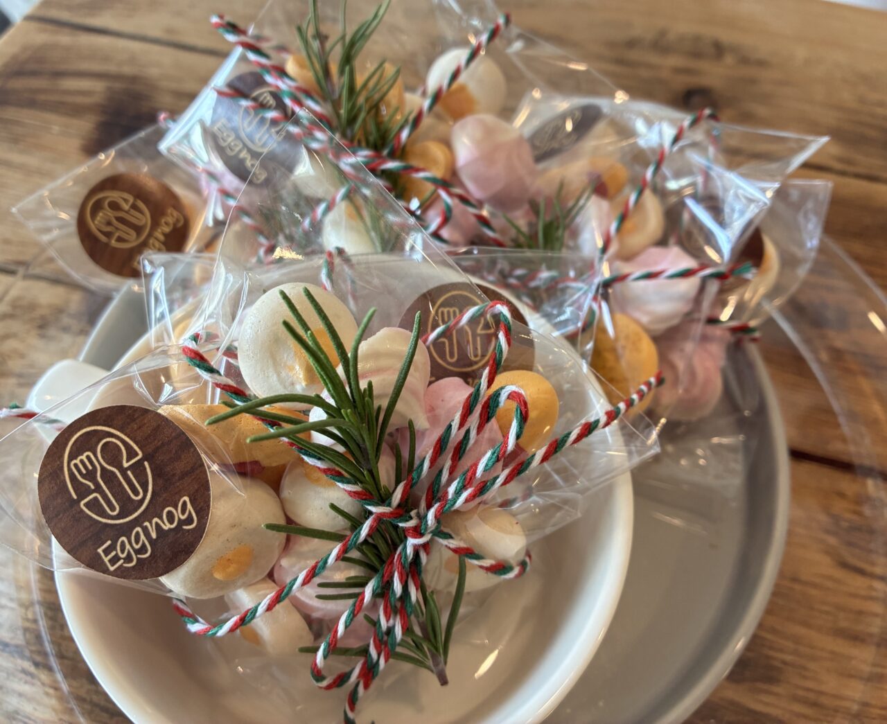 卵とオムライスのデザイン、ベビーピンクと白いメレンゲクッキーが入った、限定スイーツです。