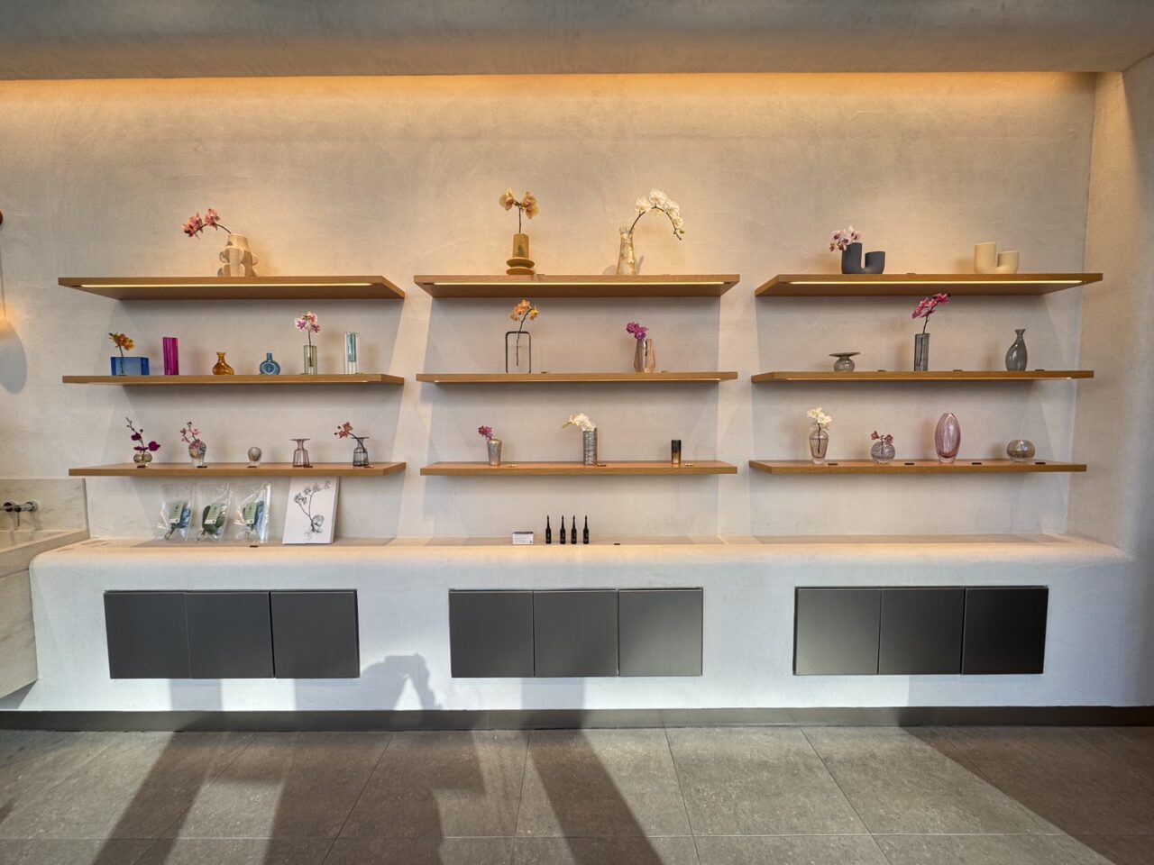 ご提供いただいた画像から、個性豊かなフラワーベースに一輪一輪が生けられた、新しいスタイルの胡蝶蘭を楽しむスペースがとっても素敵です。