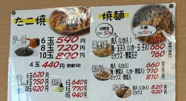 メニューは、たこ焼、焼そば、鉄板焼き、そして「焼うどん」や「オムそば」などの鉄板メニューがあります。