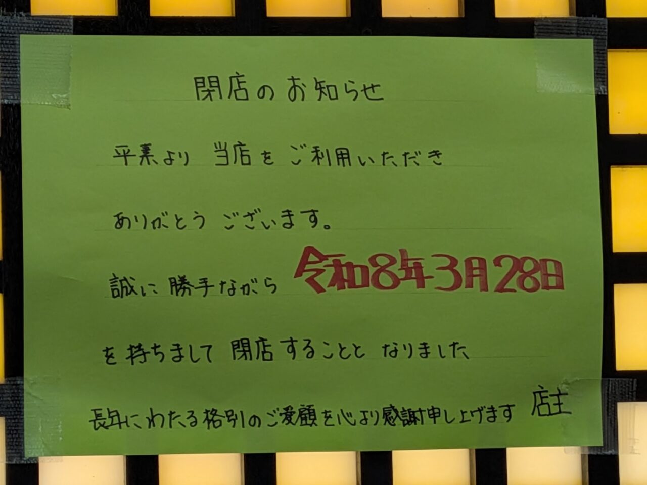 店頭には店主からの感謝を伝えるメッセージが掲示されており、突然の報せに驚きと寂しさを隠せない常連客も多いのではないでしょうか。
