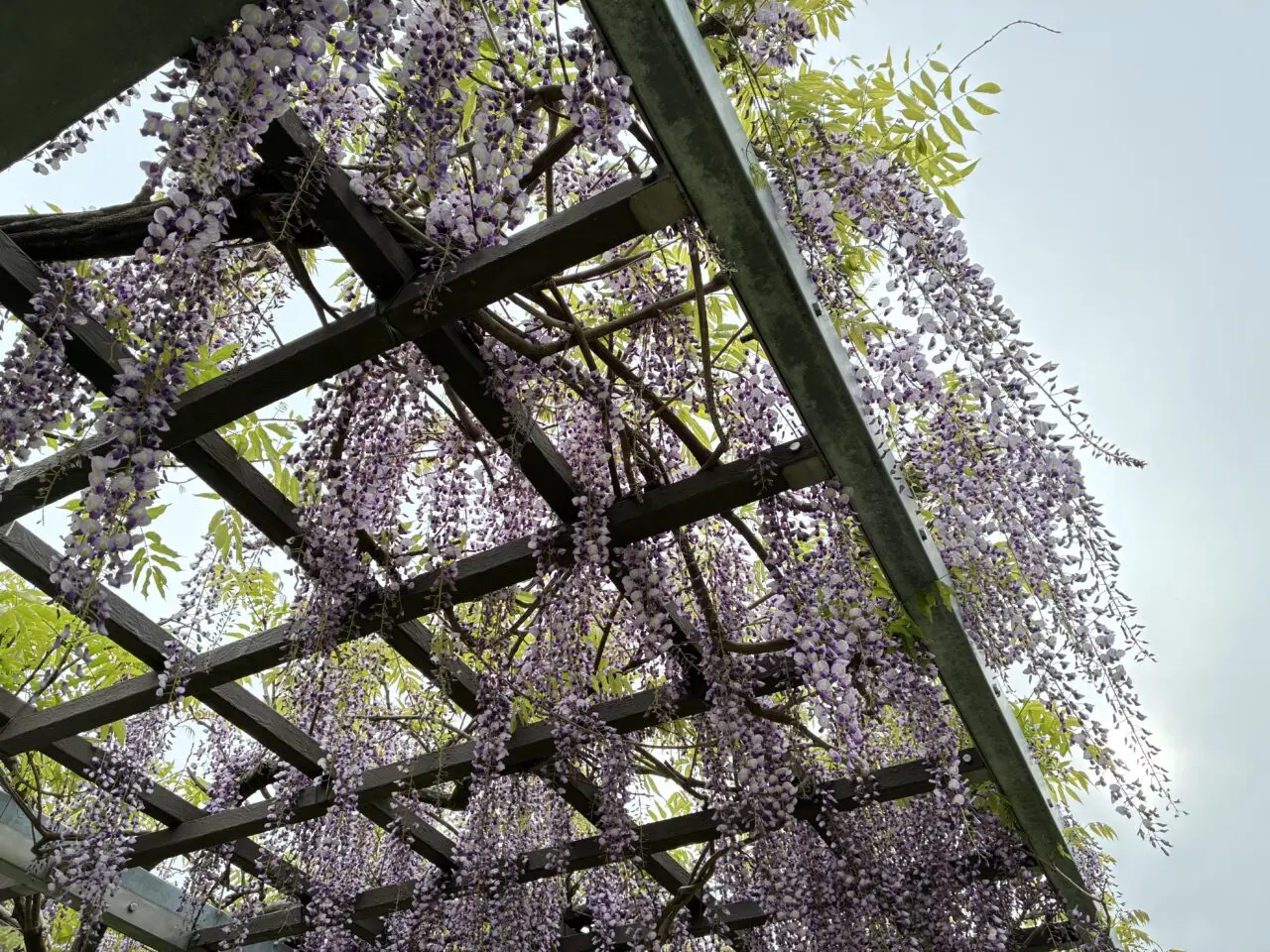 藤棚の下に一歩足を踏み入れると、そこには優雅に垂れ下がる「花のカーテン」が広がり、ほのかに甘く、高貴な香りに包まれます。
