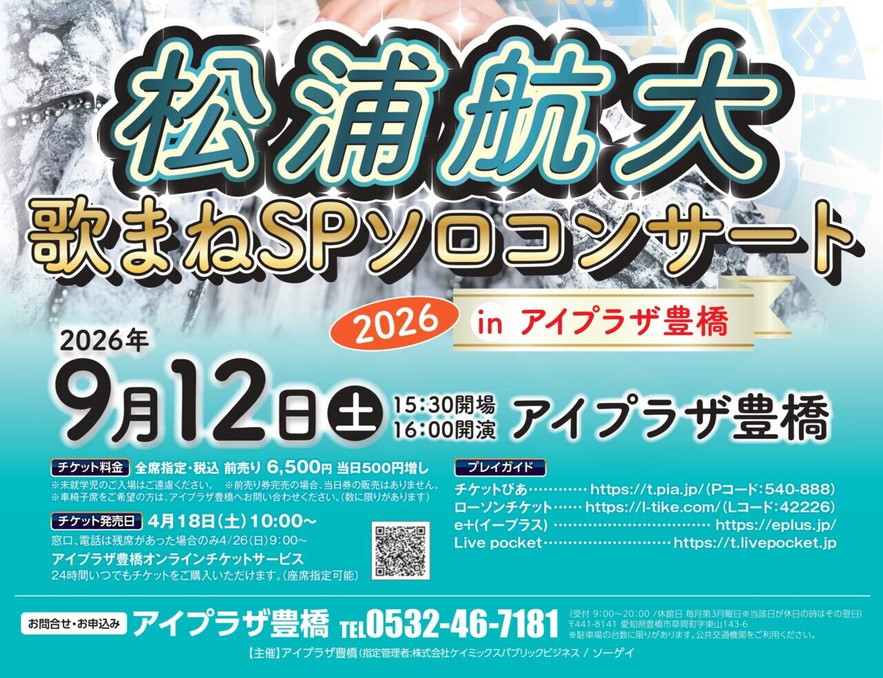 【豊橋市】変幻自在の歌声がやってくる!「松浦航大 歌まねSPソロコンサート2026」がアイプラザ豊橋で開催決定。本日4/26から窓口販売スタート!