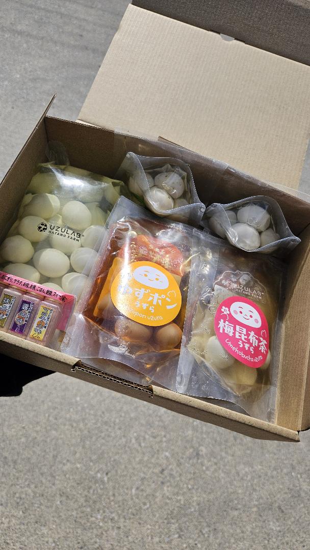 価格は2,100円。柔らか水煮(40卵)、人気の味つけ水煮、卵のお塩がセットになっています。